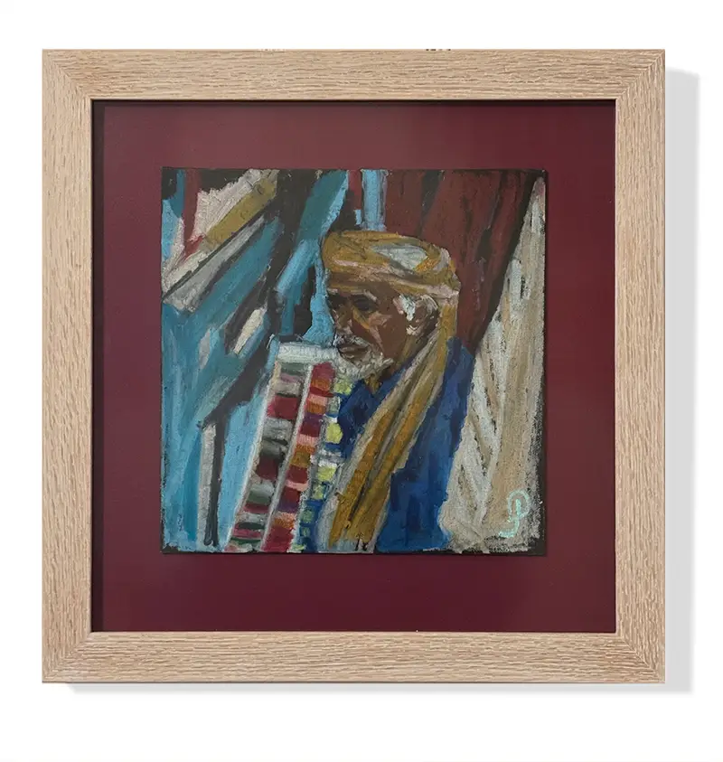 Original Painting Framed incl. non reflective glass Name: ‘Market Draper’ (Tunisia) Size: 41 x 42cm